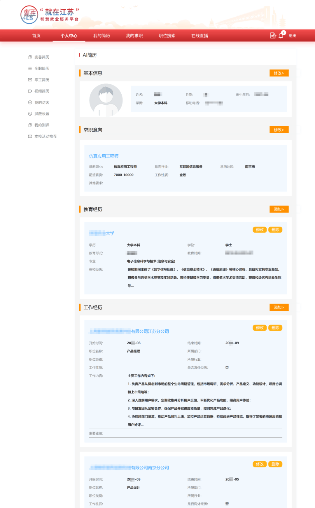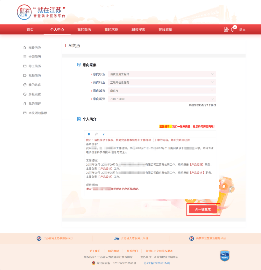 按照页面提醒,连系分歧岗亭需求精准提炼劣势亮点,系统按照“就正在江苏”平台简历模板智能生成一份简历。
